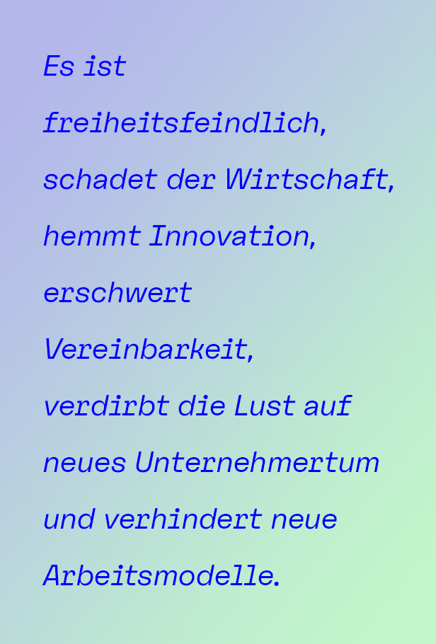„Ein „Angestelltenland“ sei Deutschland, so formuliert es Catharina Bruns, die Unternehmerin in der Kreativbranche ist und sich als Aktivistin für die freie Arbeit bekennt.“